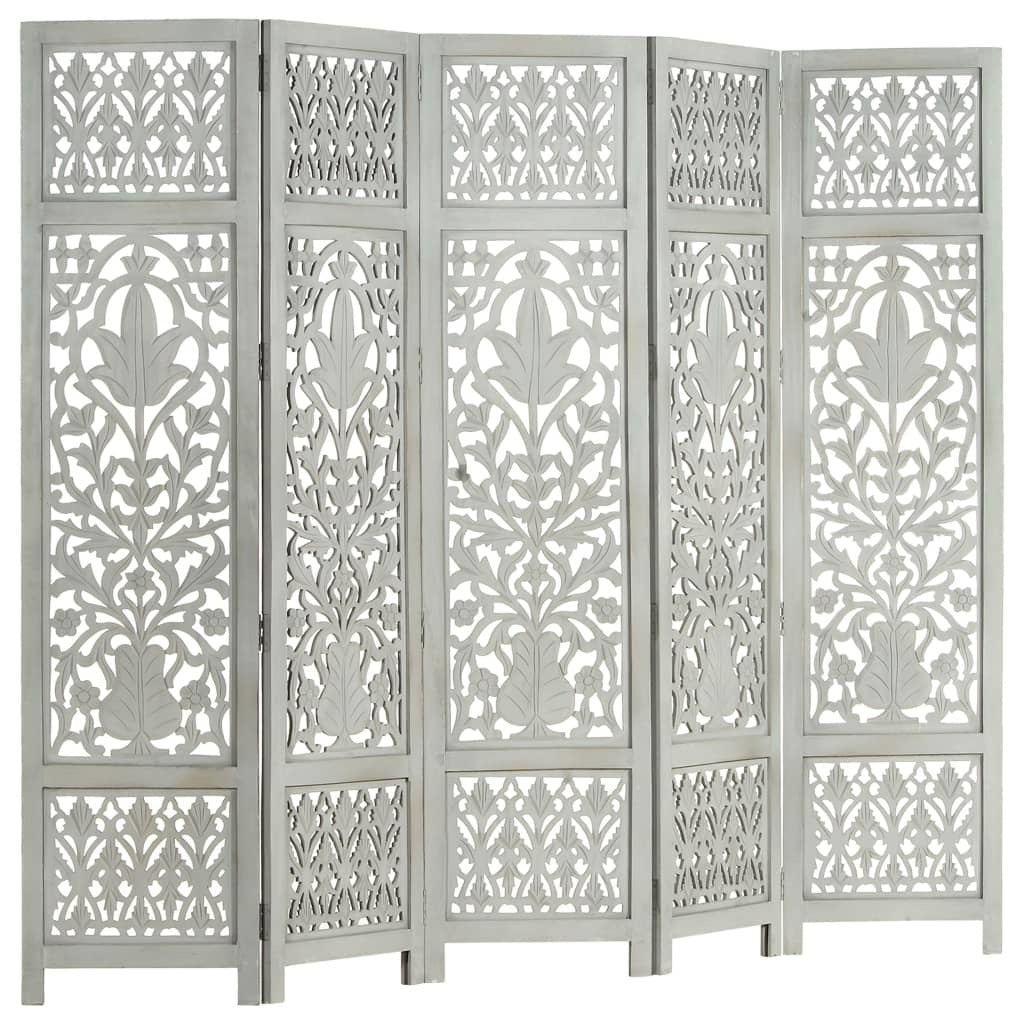 Hand Carved 5-Panel Room Divider Gray 78.7"x65" Solid Mango Wood