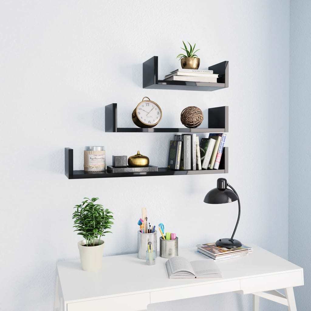 Wall Display Shelf 3 pcs High Gloss Black Engineered Wood