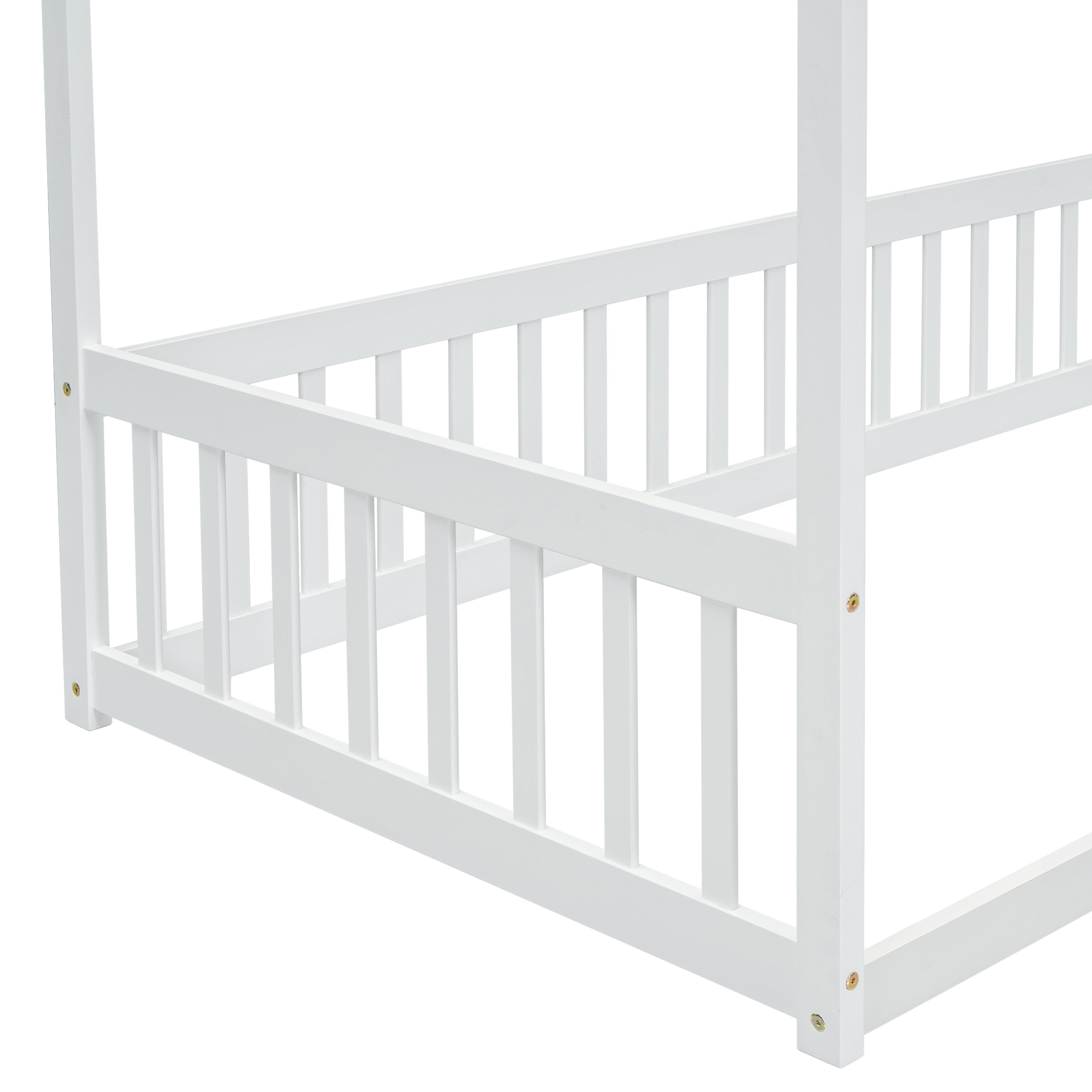 Twin Size Canopy Frame Floor Bed with Fence, Guardrails,White