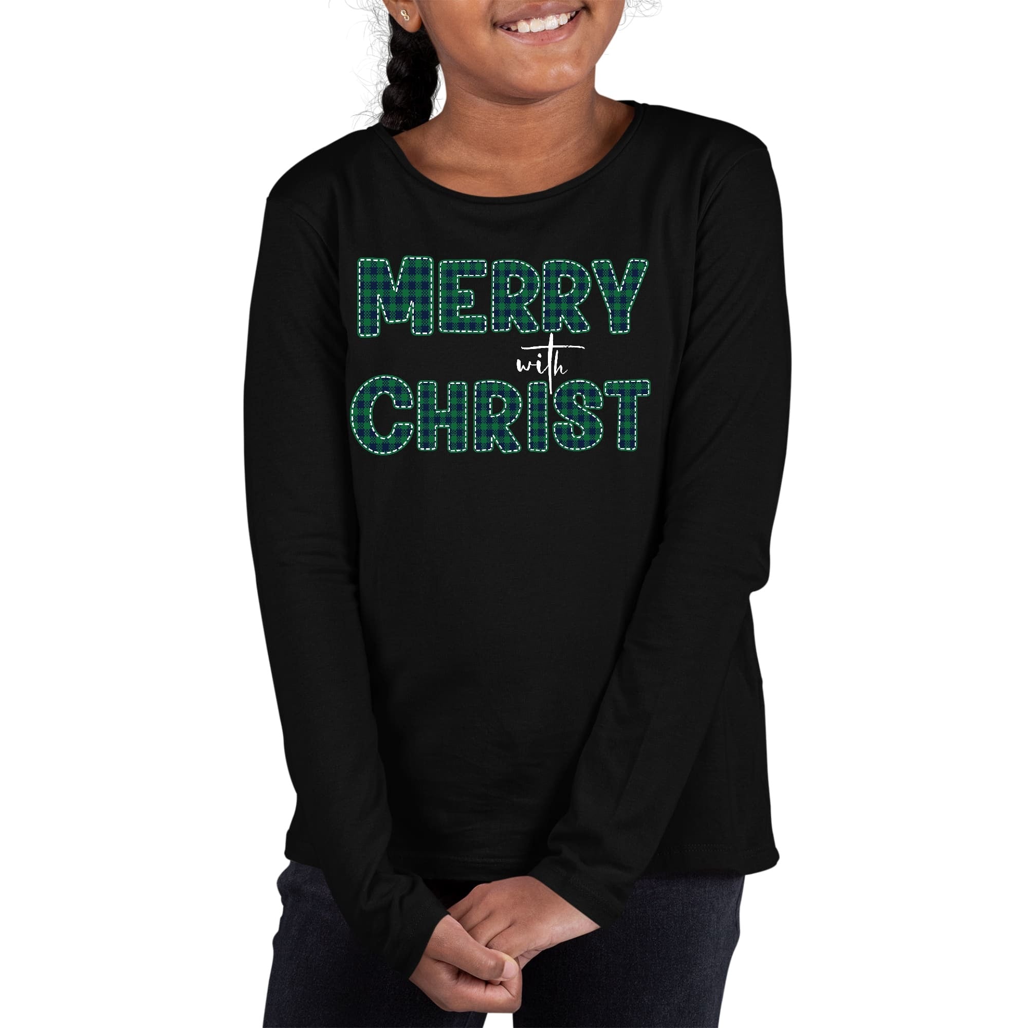 Girls Graphic T-shirt, Merry With Christ, Green Plaid Christmas
