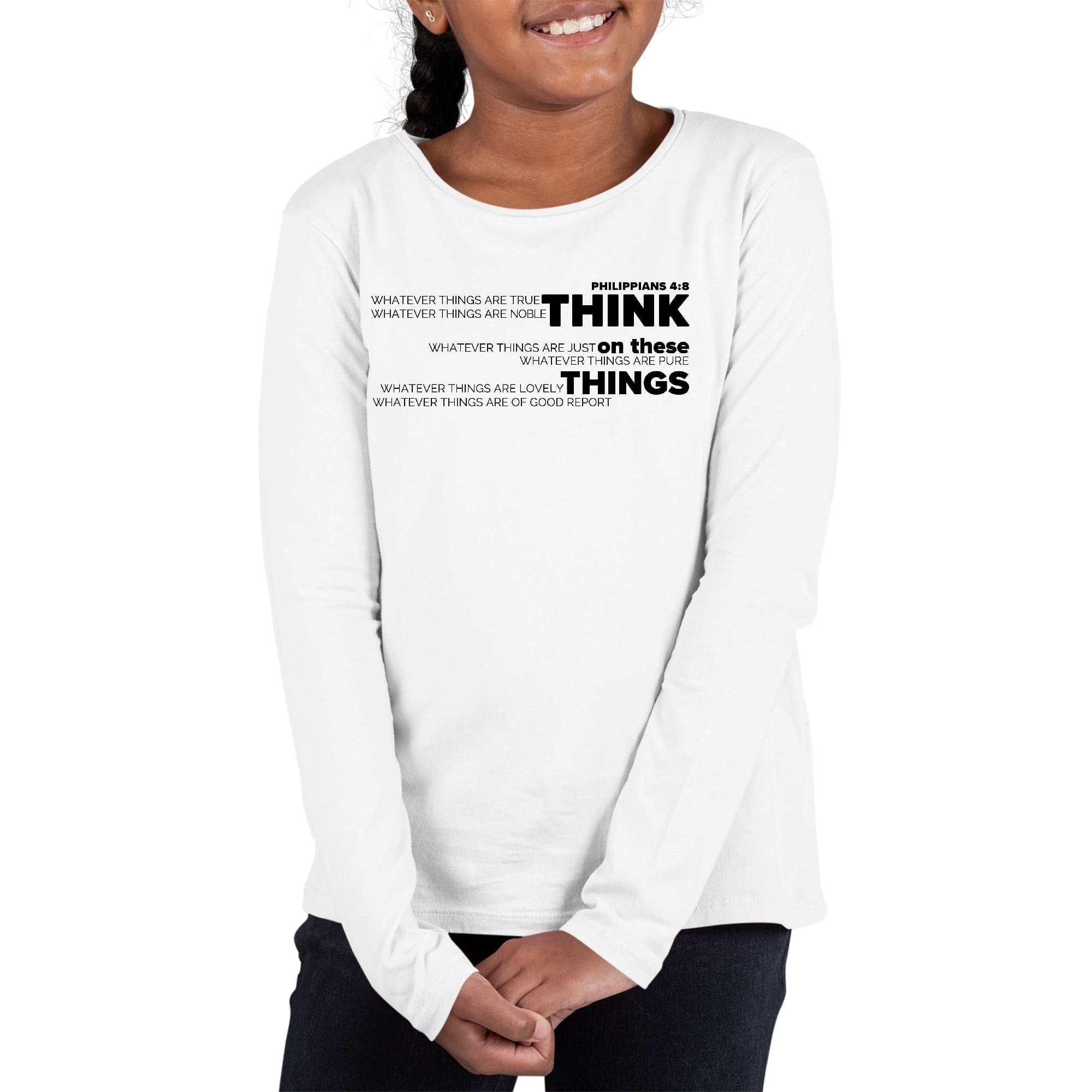 Girls Graphic T-shirt, Think On These Things Black Illustration