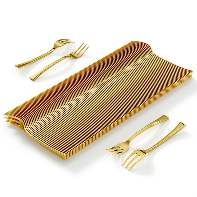 600 Piece Gold Plastic Dinnerware Set Including Plates, Cutlery and Cups