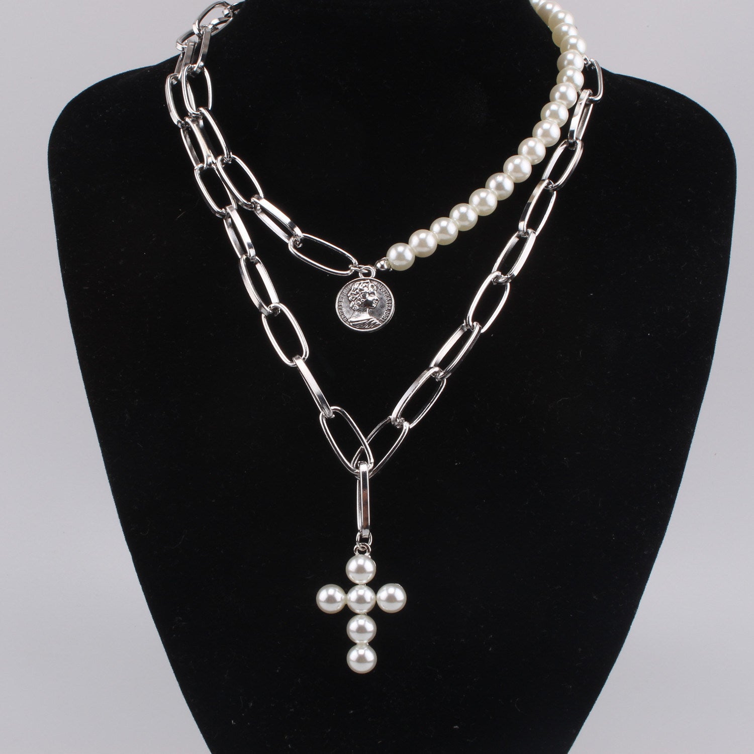 Vintage Pearl Cross Coin Pendant Necklace Women's Short Neck Chain
