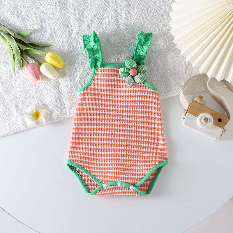 Baby Girl Striped Pattern Floral Patched Design Sling Onesies