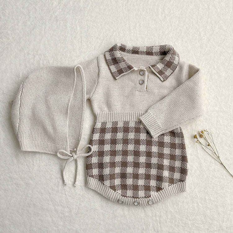 Baby Checkerboard Pattern Polo Neck Knit Warm Onesies