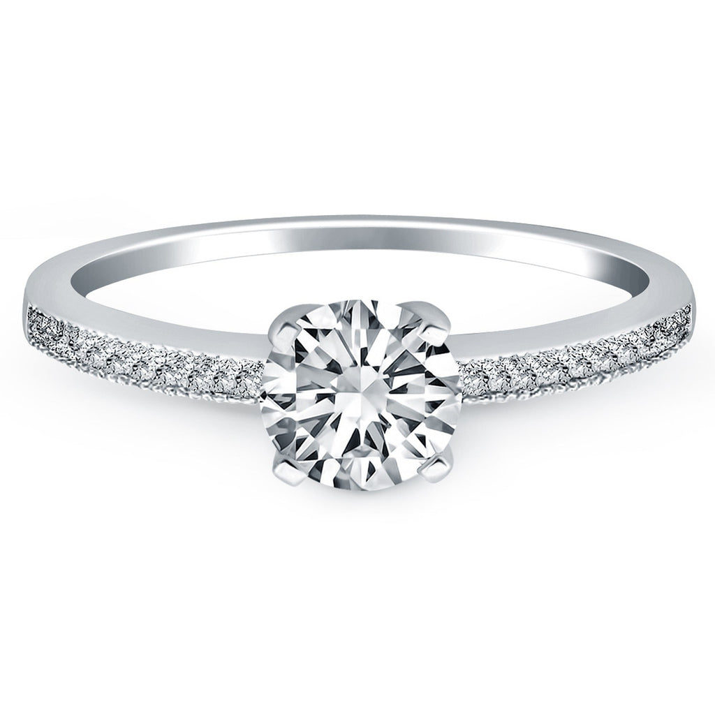 Set with glittering pave diamonds across the front of the band&44; this elegant solitaire features milgrain details. Expertly crafted in 14k white gold&44; the ring shank has a subtle taper and a bright finish. The center highlights a sparkling 1/2 carat round cut diamond.