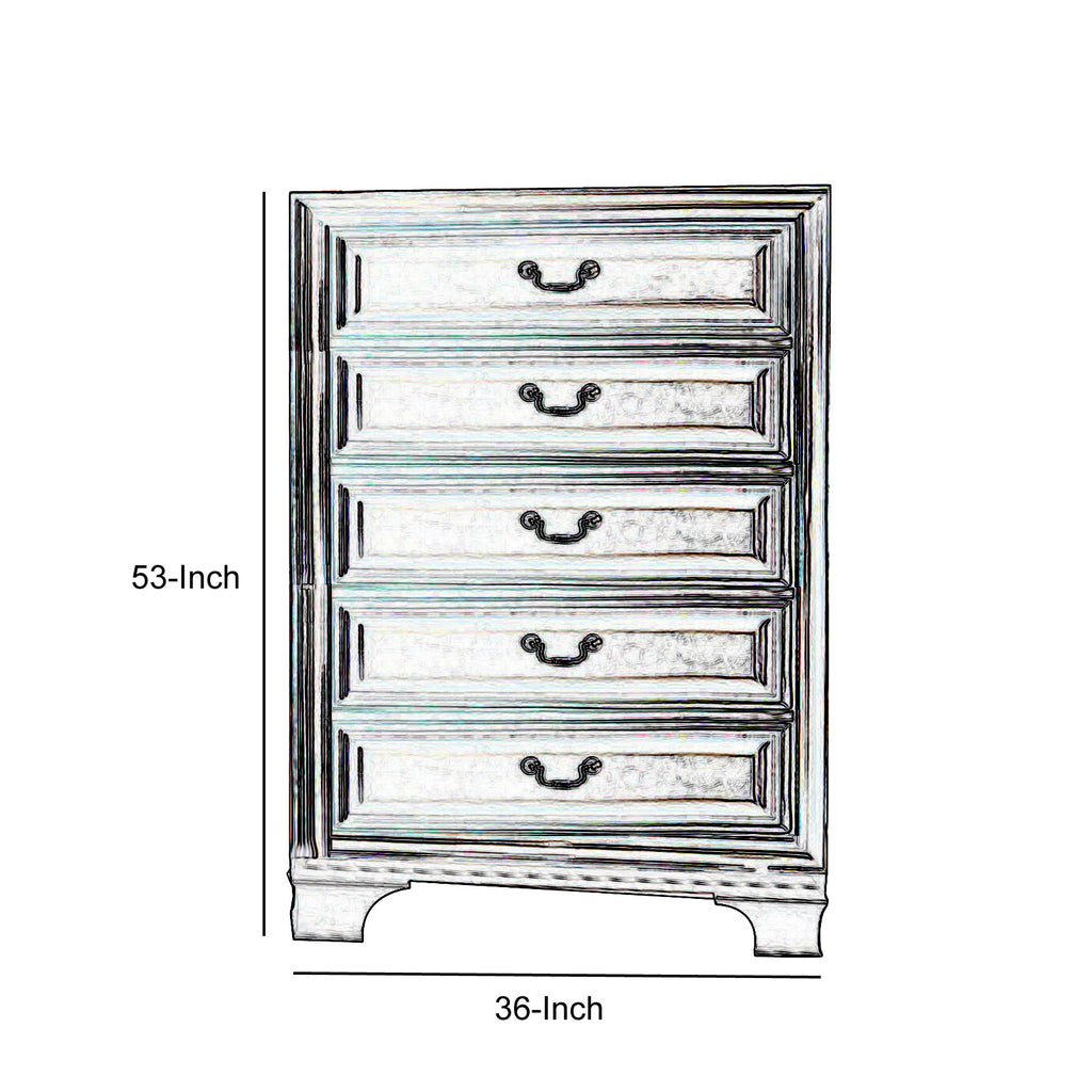 Add flair to your home with this transitional style chest which features 5 spacious drawers with antique style handles pulls and bracket legs support for enhanced aesthetics and stability. It is made sturdily from wood and enveloped with wood veneer and beveled drawer front in a brown finish. This chest will help you create a clutter free space in your living room or bedroom.