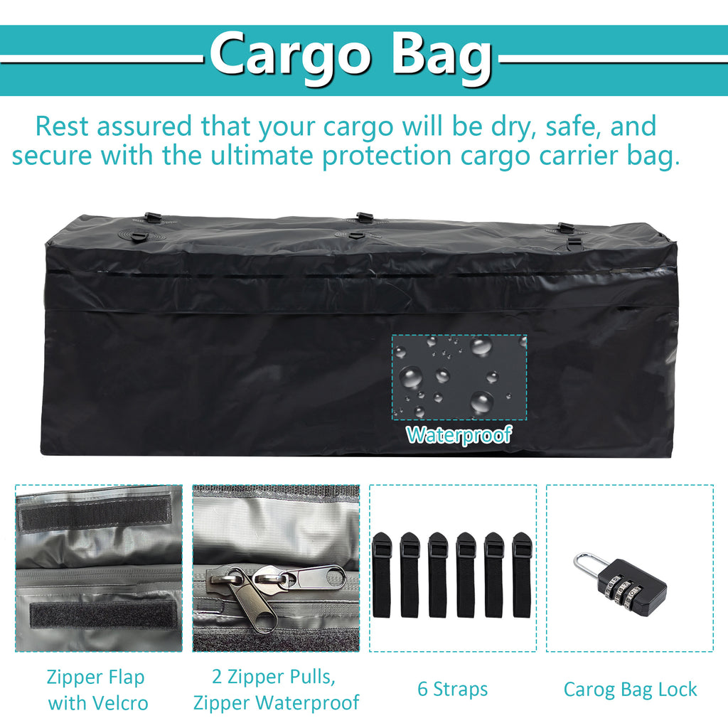 5.Accessory Included: Includes a waterproof hitch rack cargo bag that is approximately 51" L X 16.5" W X 18" H giving you a capacity of around 8.8 cubic feet. Also included a Hitch Stabilizer for Reduce noise and movement while driving and 2 rainproof ratchet straps for secure cargo in basket, ensure your belongings are securely transported.