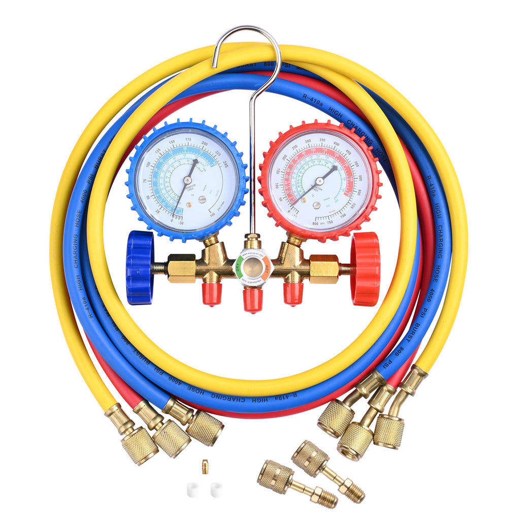 - Dual Manifold Gauge - Features blue gauge for low pressure(0 to 500PSI) and red gauge for high pressure(0 to 800PSI) to meet different needs of users; Large and colored dials display R410a; R22; R404a refrigerant and Fahrenheit degree for allowing easy and accurate reading