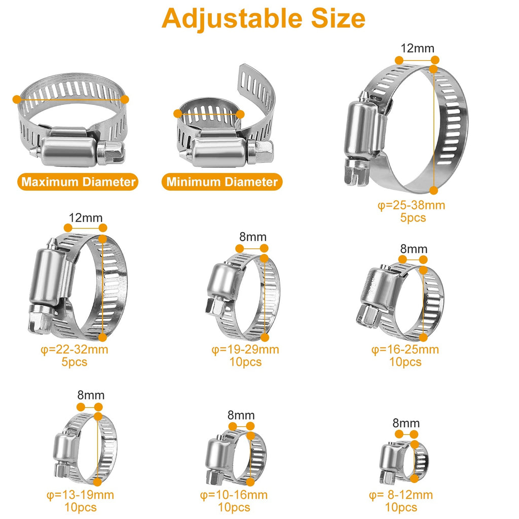 **What You Get*:Hose clamps of 8-12mm/10pcs;10-16mm/10pcs;13-19mm/10pcs;16-25mm/10pcs;19-29mm/10pcs;22-32mm/5pcs;25-38mm/5pcs.