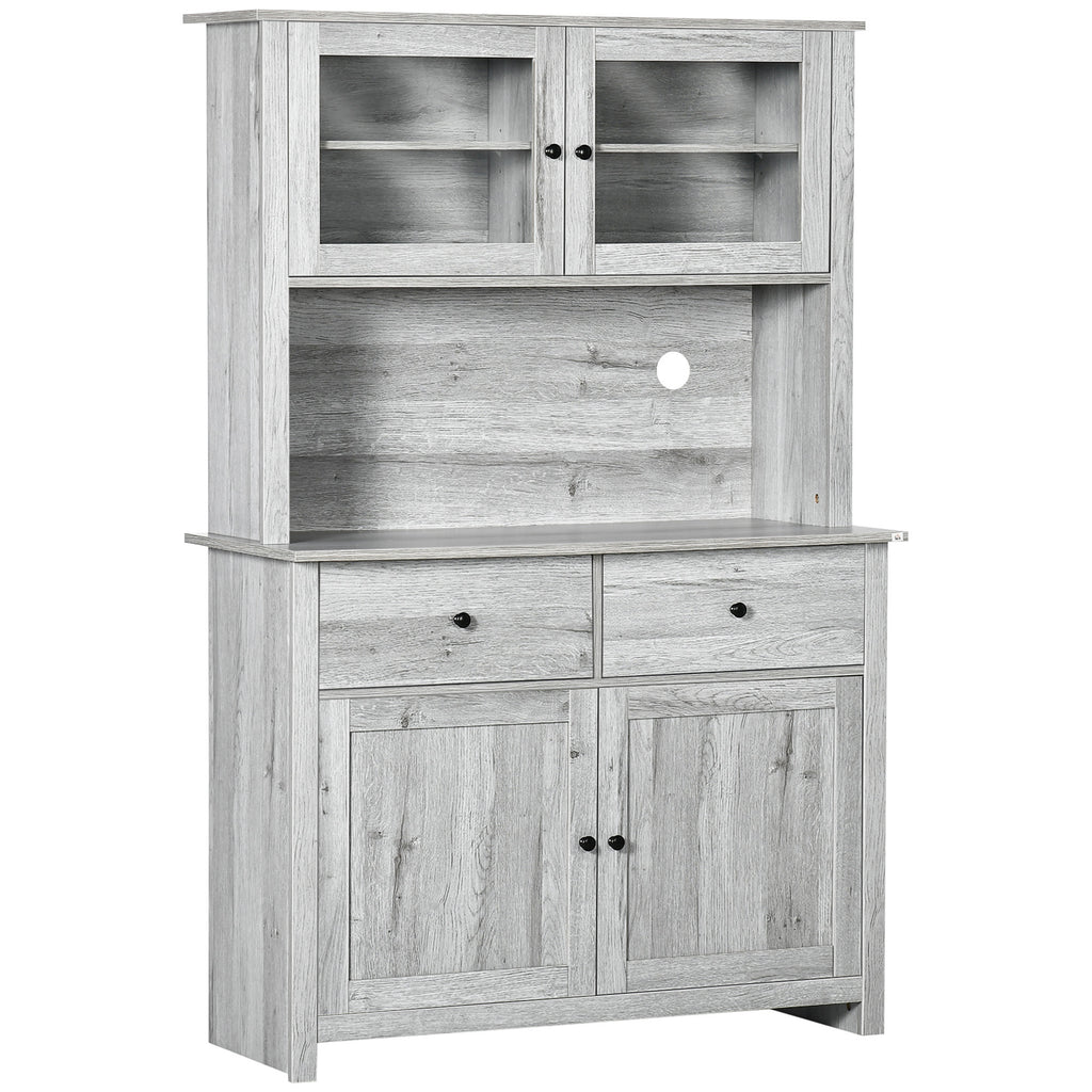 Upgrade Your Storage: The multilayer shelves of this kitchen hutch give you plenty of room for dishes, cookbooks, pots and pans, dry goods while the two drawers allow you to put away napkins, towels, and silverware. The open middle space can hold kitchen appliances such as a microwave or coffee maker. If you have taller items, adjustable shelves can be customized to fit things like pitchers, pasta containers, and blenders. Cable management cleans your desk space and maintains a safe counter.
