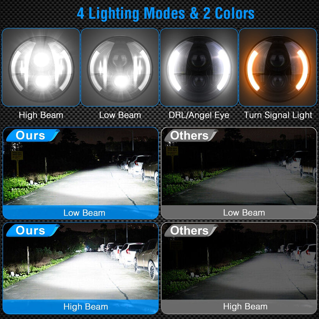 *4 Lighting Modes & 2 Colors*:Designed with a cool halo ring which can be used as DRL guide light with bright white LEDs and turn signal light with bright amber LEDs to make your car attractive and meantime improve driving safety. High beam and low beam modes offer you different illuminating choice to meet your driving need.