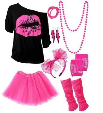 2. Set Include: 1x lips out of the shoulder t-shirt, 1 x tutu dress, 1x pair of leg warmers, 1x headband, 1x necklaces, 2x fingerless long meshs gloves, 2x fingerless short meshs gloves, 1x pair of flash earrings, 1set neon silicone bracelet. Our 80s will meet the needs of your make-up party. It is a great costume for Halloween and carnival parties, stage performances and birthday parties.