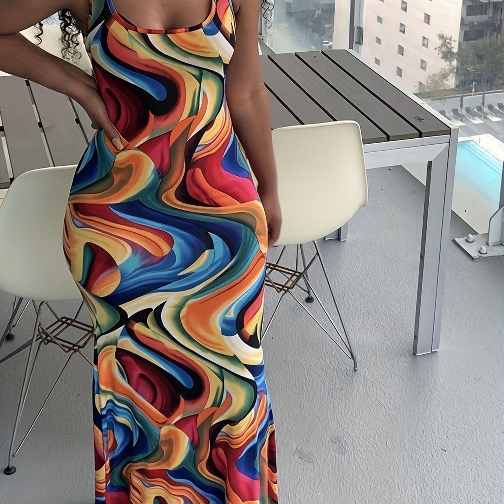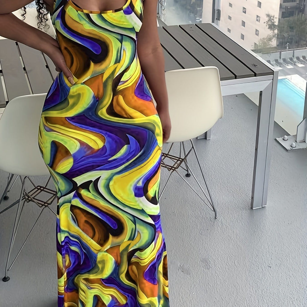 Abstract Ripple Print Dress, Sexy U Neck Sleeveless Bodycon Maxi Dress, Women's Clothing