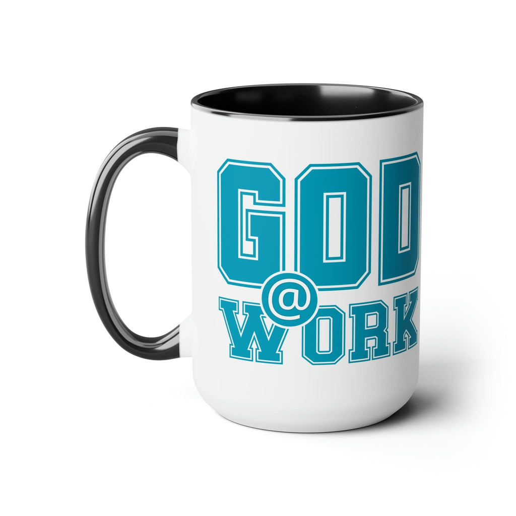 God @ Work Blue Green And White Print Ceramic Coffee Mug. Warm-up with a nice cuppa out of this two-tone accent ceramic coffee mug. This mug is perfect for your morning cup of coffee, tea, hot cocoa, or any other hot beverage. It's also great for cold beverages! The ceramic mug is microwave and dishwasher safe. It's BPA and Lead-free, and made of durable ceramic in 15-ounce size.