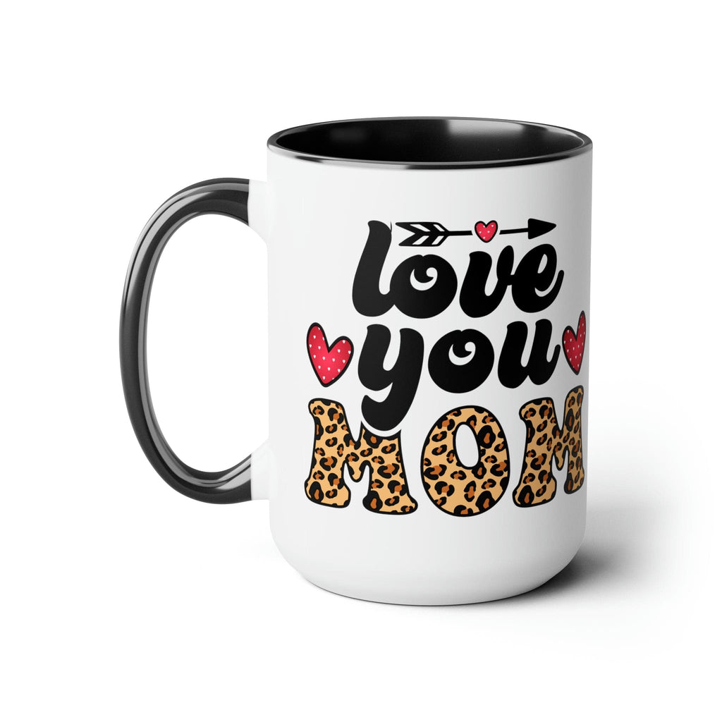 Love You Mom Leopard Print Black Illustration Ceramic Coffee Mug. Warm-up with a nice cuppa out of this two-tone accent ceramic coffee mug. This mug is perfect for your morning cup of coffee, tea, hot cocoa, or any other hot beverage. It's also great for cold beverages! The ceramic mug is microwave and dishwasher safe. It's BPA and Lead-free, and made of durable ceramic in 15-ounce size.