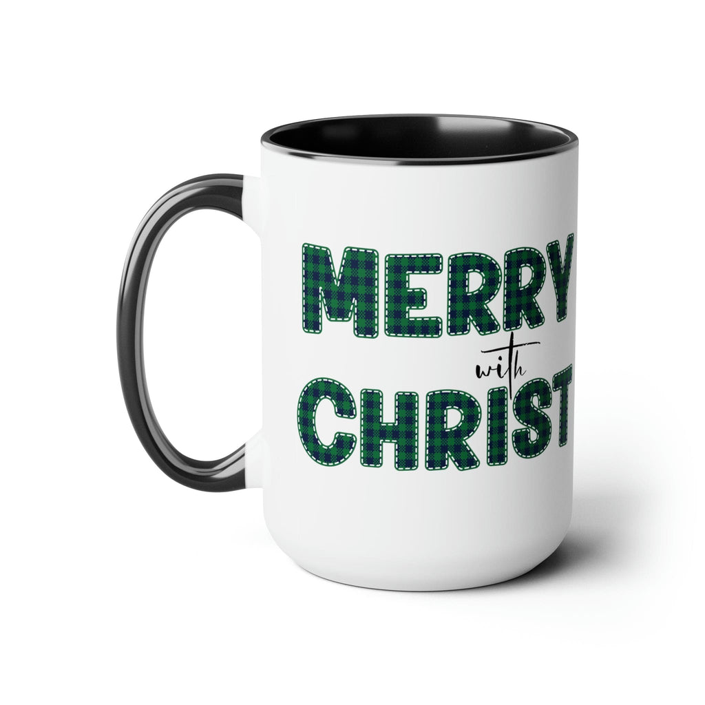 Merry With Christ, Green Plaid Christmas Holiday Pattern Print Ceramic Coffee Mug. Warm-up with a nice cuppa out of this two-tone accent ceramic coffee mug. This mug is perfect for your morning cup of coffee, tea, hot cocoa, or any other hot beverage. It's also great for cold beverages! The ceramic mug is microwave and dishwasher safe. It's BPA and Lead-free, and made of durable ceramic in 15-ounce size.