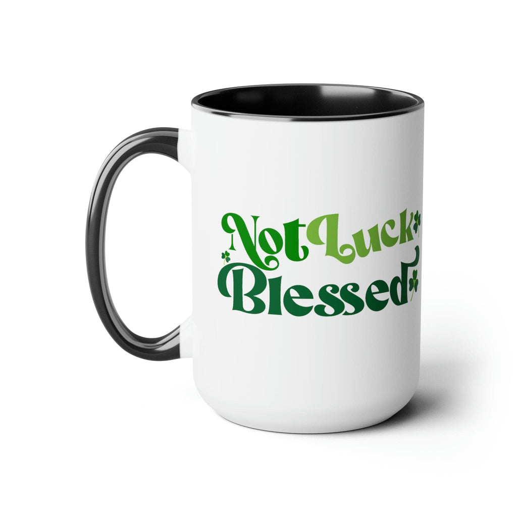 Not Luck Blessed Ceramic Coffee Mug. Warm-up with a nice cuppa out of this two-tone accent ceramic coffee mug. This mug is perfect for your morning cup of coffee, tea, hot cocoa, or any other hot beverage. It's also great for cold beverages! The ceramic mug is microwave and dishwasher safe. It's BPA and Lead-free, and made of durable ceramic in 15-ounce size.