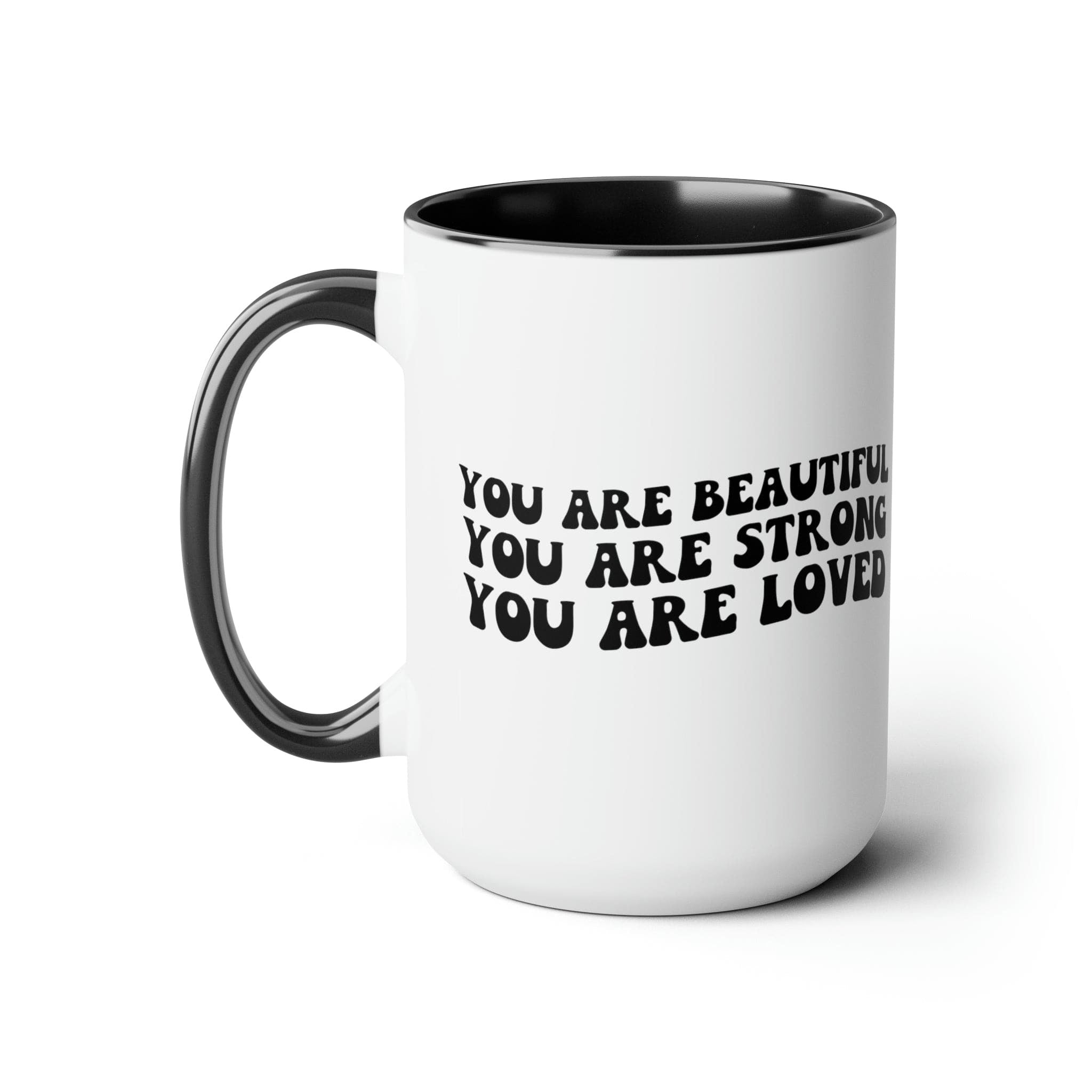 You Are Beautiful Strong Black Illustration Ceramic Coffee Mug. Warm-up with a nice cuppa out of this two-tone accent ceramic coffee mug. This mug is perfect for your morning cup of coffee, tea, hot cocoa, or any other hot beverage. It's also great for cold beverages! The ceramic mug is microwave and dishwasher safe. It's BPA and Lead-free, and made of durable ceramic in 15-ounce size.