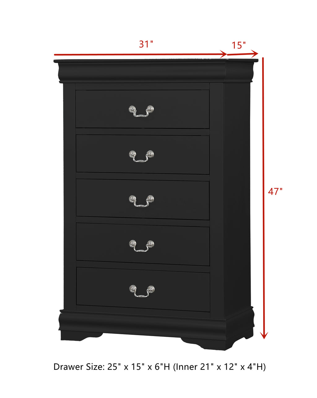 The Louis Philippe Chest in black finish is equipped with brushed nickel metal hardware that lends antique elegance. Store bedding, clothing, and more in the five roomy drawers. Choose from available finish options to best coordinate with existing bedroom furniture.