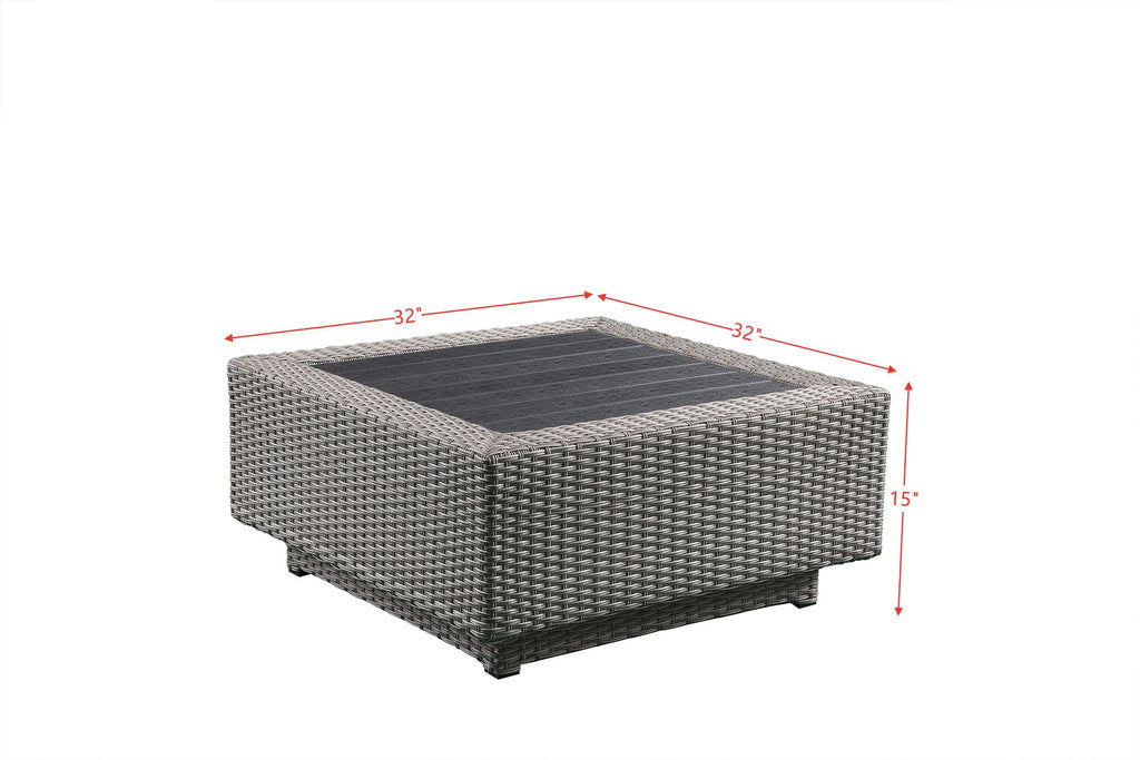 •Assembled, Patio Sectional & Cocktail Table (Stationary/NO Storage)• Cushions & 4 Pillows Included• Shape/Orientation: "L" Shape, Reversible Armless Chair (Easily Converts LF/RF or to Separate Seat)• Includes: LF & RF Armless Loveseat with Side Table, Wedge, Rev. Armless Chair, Cocktail Table ()• FEATURES: Loose Back & Seat Cushions• CONSTRUCTION: Frame Gray Finish, Wicker (8 x 1.3mm Flat) & Aluminum Powder Coated (20 x20 x1.2mm, 18 x 18 x 1.0mm)• SEAT CUSHIONS: Beige Finish, 6 Reversible Cushions, Filling 90% Foam, 10% Polyester, Cushion Size: 4 Inches Thick (100mm)• Backrest: 7 Cushions, Filling 100% Polyester• Side Table & Cocktail Table Top: Plastic Slatted Top, Slate Finish• Armless• Wicker Base• Material: Beige Fabric (Solid Pattern & Welt Trim)• Square Shape Pillows: Orange Fabric, Removable Cover (Solid Pattern)