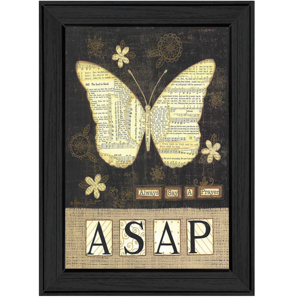 ALP1076A-405 "Always Say a Prayer" is a 11"x15" framed print by Annie LaPointe. This artwork features a butterfly, ASAP in large letters and the words always say a prayer. This totally American Made wall decor item features an attractive black frame, a textured canvas like finish so no glass is necessary and is ready to hang. •Women Owned (WBE)•Textured Artwork with a 'rolled on' acid free acrylic coating to create a canvas painting effect. No glass is necessary.•UV protectant coating protects artwork from fading.•MDF moulding adds natural beauty to the framed art. Frame is keyholed for ease of hanging.