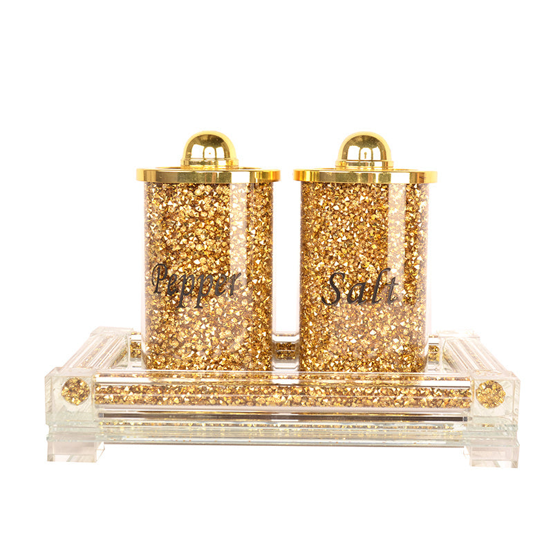 Ambrose Collection features exquisite salt & pepper canisters with tray in crushed diamond glass. Metal shaker top included with each canister. This beautiful accessory doubles as a functional piece and decorative accent bringing a modern touch to any home. Packaged in an elegant box, this is a perfect gift idea for your special loved one. The set includes two canisters and a tray. Canisters are 5.5 In. High x 2.5 In. Diameter. The tray is 8 In. L x 6 In. W x 1 In. H. Canisters not designed for liquids. Items not dishwasher safe, simply clean with a damp cloth.