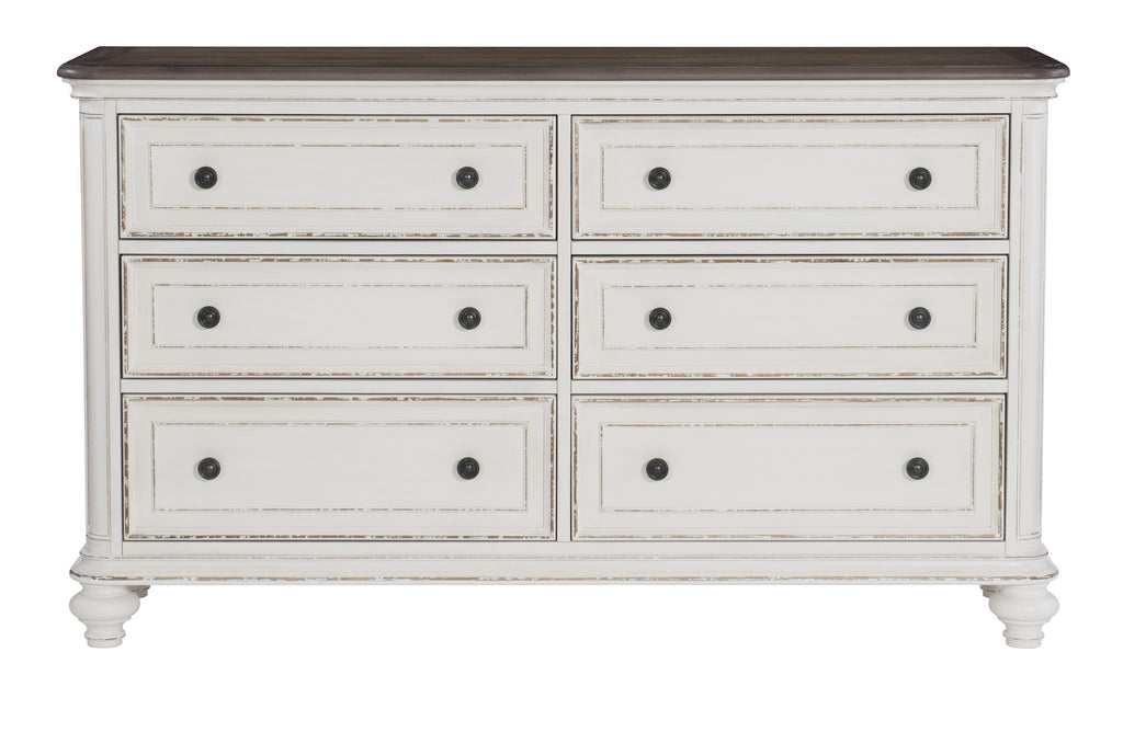 Soft, sweeping curves define the elegant profile of the Baylesford Collection. The dresser is softened by an antique white rub-through finish with a brown-gray finished framed-plank top, creating a romantic aesthetic will place beautifully within your bedroom. Dark finished metal knob hardware provides complementing contrast to the drawer fronts.PRODUCT DIMENSIONS:Overall Dimension: 64" x 18" x 37.75"HDrawer interior: 25.5" x 13.5" x 6" (2); 25.5" x 13.5" x 7.5" (4)Listing Includes: One Dresser Only.Mirror, Nightstand, Bed and Chest: Not included.Simple assembly required.