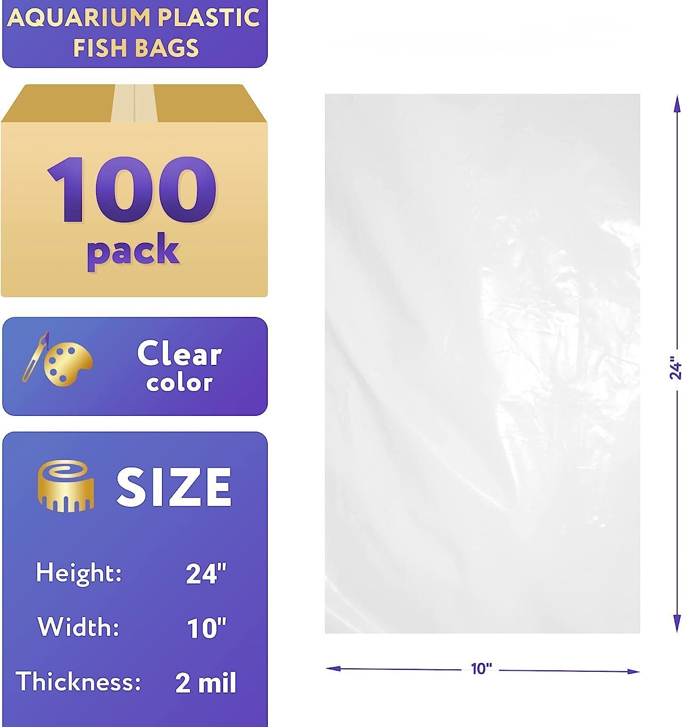LDPE Flat Bags for Fish Transportation Quantity: 100 Type: Open Top Lay Flat Poly Bags Material: 100% Virgin Low Density Polyethylene Color: Clear Width: 10 inches Height: 24 inches Thickness: 2 mil Gauge: .002 Recyclable Transporting fish is a very important part of fish culture. Fry and fingerlings must be transported from hatchery to pond for stocking. Brood fish are sometimes transported into the hatchery to spawn. Our plastic fish bags are perfect for bringing fish home from the aquarium. With one open end; these polyethylene aquarium bags can be secured with twist ties for easy transport. It is essential to maintain adequate oxygen in the water while transporting fish. The technique recommended for oxygenating water during fish transport is use of pure bottled oxygen. It may injected into a plastic bag containing water and fish which is then sealed air-tight for transport. When plastic bags are used; oxygen is added after water and fish. One-fourth of the bag usually contains water and fish and three-fourths contains oxygen. After adding oxygen the bag is sealed shut with a twisted rubber band; string or other material. The sealed bag of fish is then placed in a box; woven grass bag or other container for added protection and loaded onto a vehicle for transport. If properly packaged and insulated from heat; these containers can transport fish for 24 to 48 hours without water exchange. SATISFACTION GUARANTEE: Clear packing bags are backed by 100% guarantee. If you are not completely satisfied with the product; you'll receive your money back!