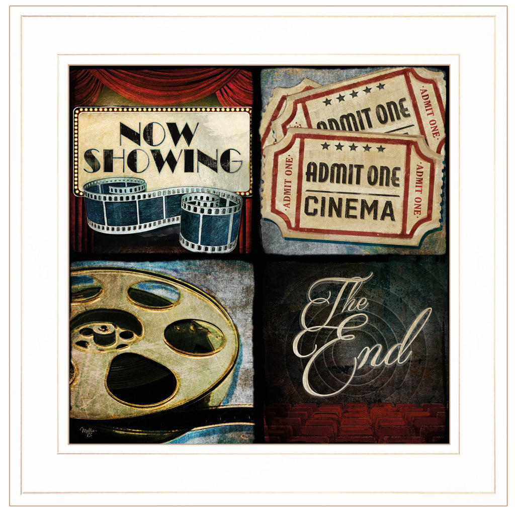 MOL1541-226G - "At the Movies I" by Mollie B. This 15x15 White framed print inspired by vintage movie theaters. Movie reels, admission tickets, and end script all stylized in bold blacks, reds, whites, and creams. A classic addition to any media room. This totally American Made wall decor item features an decorative white frame. The framed art print has a protective, archival finish (glass is not needed) and arrives ready to hang.•Textured Artwork with a 'rolled on' acid free acrylic coating to create a canvas painting effect. No glass is necessary.•Surface of the print has a fade resistant coating.•Arrives Ready to Hang•Woman Owned Business (WBE)•Handmade in the USA•Decorative Moulding adds natural beauty to the framed art.