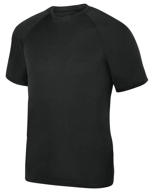 100% polyester wicking knit; Wicks moisture away from the body ; Updated fit has longer length and bigger chest for added comfort; Pad print label ; Self-fabric crewneck collar; Raglan sleeves provide greater range of motion ; color secure technology helps prevent dye migration;