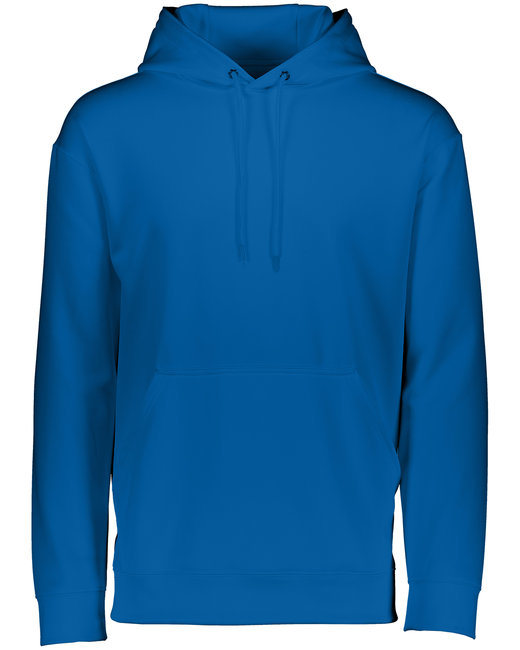 100% polyester performance wicking fleece; Wicks moisture away from the body; Self-lined hood; Drawcord in hood on Adult sizes only; Set-in sleeves for maximum mobility; Double-needle coverstitched cuffs and bottom band; Front pouch pocket;