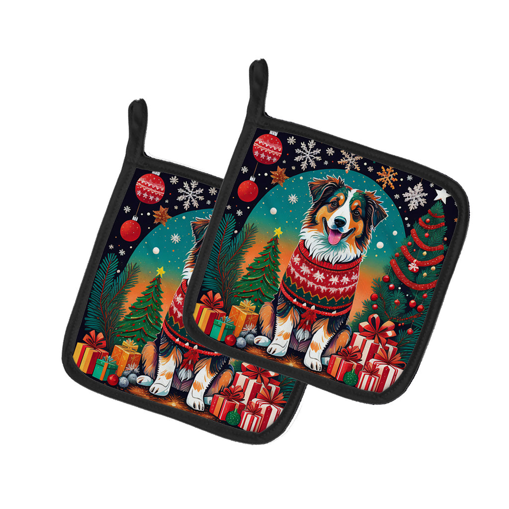 Pair of Pot Holders featuring breed specific Australian Shepherd artwork. Celebrate Christmas with this Christmas Pair of Pot Holders. A Pair of Pot Holders to match your kitchen decor. Made in the USA these are thick and functional. Full color artwork decorates the front polyester fabric of the hot pad and accented by a black trim. Use these at as a trivet for your Thanksgiving or Christmas tablescape. Filled with insulated fabric and quilted for durability. These colorful pot holders will make a great gift for your favorite home cook or executive chef. Each pot holder measures approximately 7 1/2 inches by 7 1/2 inches. A hanging tab is included.