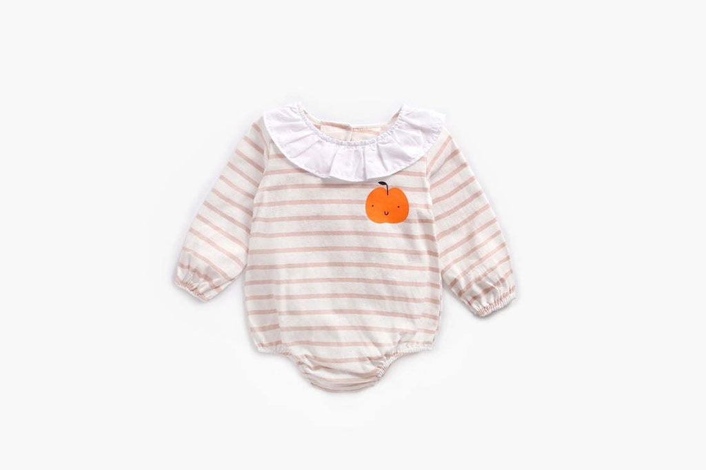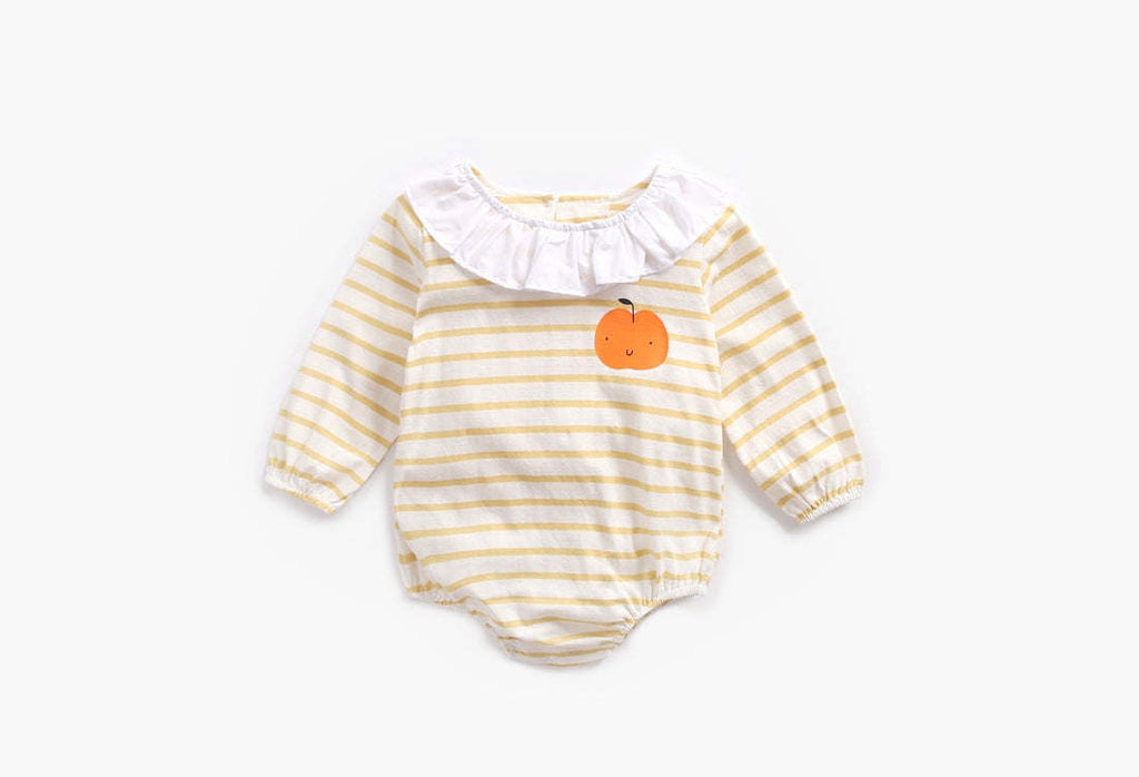 This delightful onesie combines classic ruffle neck styling with a modern; eye-catching cartoon and striped pattern; creating an aesthetically look that's perfect for your little one. Crafted with care; this onesie is sure to elicit admiring glances whenever it's worn.