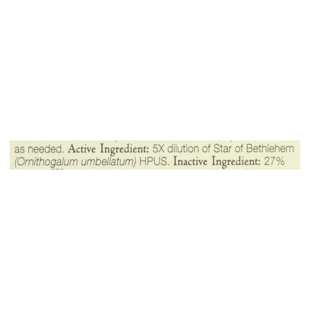 ingredients : active ingredient: 5x dilution of star of bethlehem;ornithogalum umbellatum;hpus. Inactive ingredient: 27% alcohol