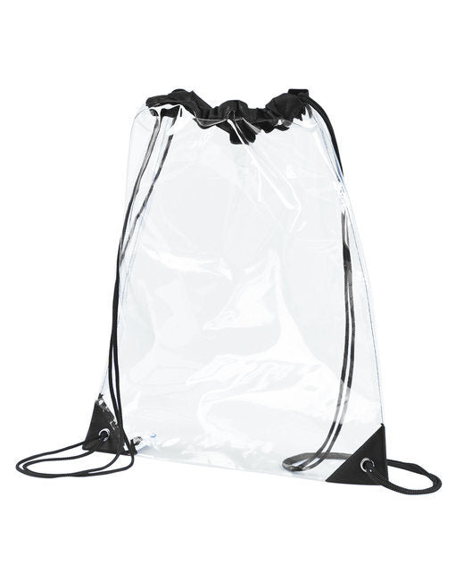 PVC; Clear PVC body; Contrasting binding; Contrasting drawstring straps; 13"W x 16"H ; Requires California Prop 65 Warning Label;