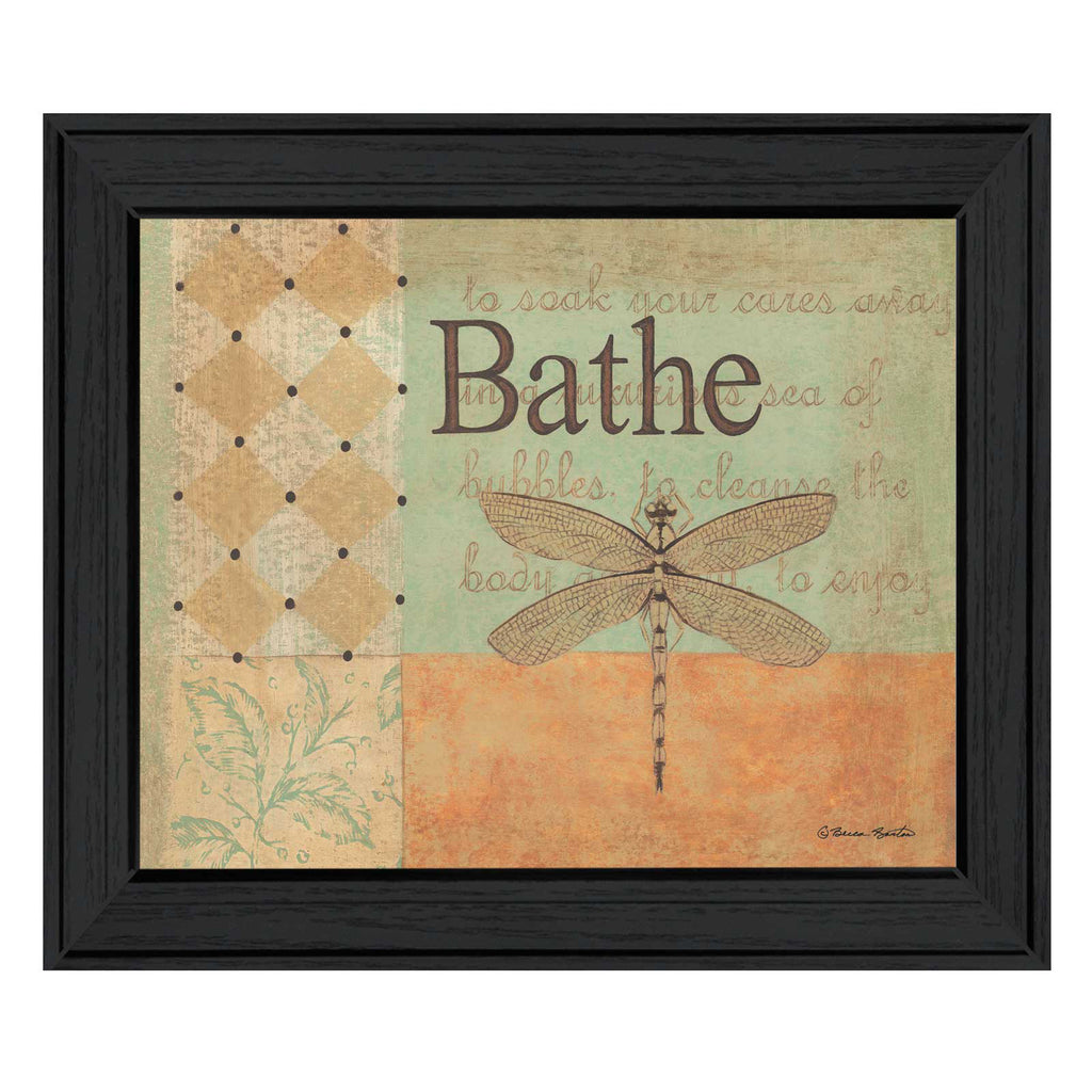 BB703-405"Bathe" is a 11"x13" framed print. This features the word Bathe with a dragonfly, done in shades of light orange, green and brown by artist Becca Barton. This totally American Made wall decor item features an attractive black frame, a textured canvas like finish so no glass is necessary and is ready to hang.•Women Owned (WBE)•Textured Artwork with a 'rolled on' acid free acrylic coating to create a canvas painting effect. No glass is necessary.•UV protectant coating protects artwork from fading.•MDF moulding adds natural beauty to the framed art. Frame is keyholed for ease of hanging.