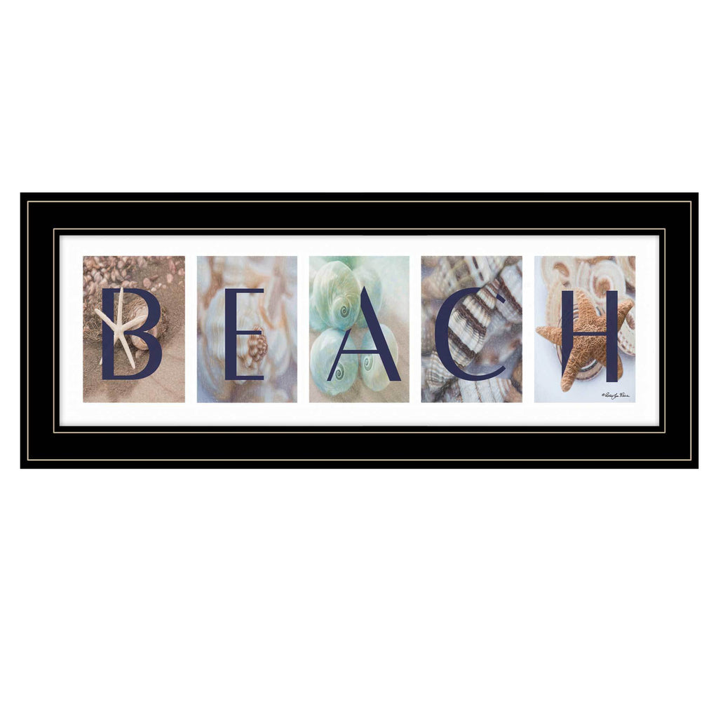RLV572-704G "Beach" by artisan Robin-Lee Vieira. This decorative black grooved framed print(21x9) has a unique way of spelling out "BEACH"; Each letter a section of it's own with sand, shells and star fish; white matted. The surface of the print is textured with a fade resistant coating so no glass is necessary. Arrives ready to hang. Made in the USA by skilled American workers. •Textured Artwork with a 'rolled on' acid free acrylic coating to create a canvas painting effect. No glass is necessary.•Surface of the print has a fade resistant coating.•Arrives Ready to Hang•Woman Owned Business (WBE)•Handmade in the USA•Decorative Moulding adds natural beauty to the framed art.