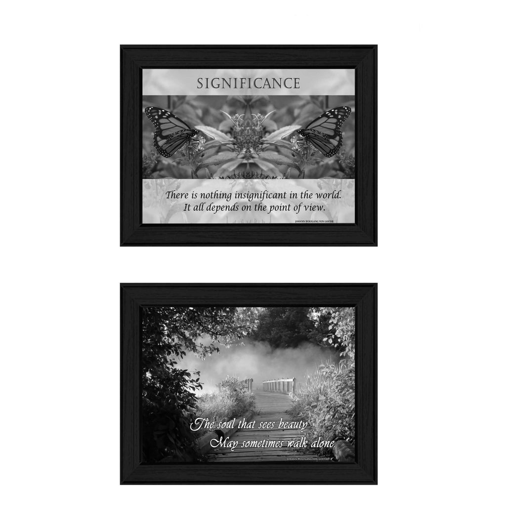 "Beauty" is a set of (2) 10"x14" matching framed framed art prints of nature photography with inspirational and motivational script (Black&White/Grayscale). This set features a mirrored butterfly with a quote about significance, and a beautiful bridge in the mist with a quote about beauty (Quotes by the famous philosopher, Goethe). Both are beautiful additions to the home, school, business or office. The prints have a textured, archival protective finish (no glass is needed), are in quality frames and arrive ready to hang. They are made in the USA with pride by American workers.•Women Owned (WBE)•Textured Artwork with a 'rolled on' acid free acrylic coating to create a canvas painting effect. No glass is necessary.•UV protectant coating protects artwork from fading.•Arrives Ready to Hang