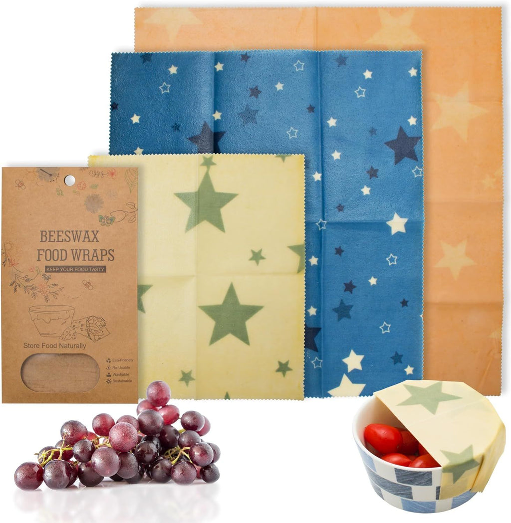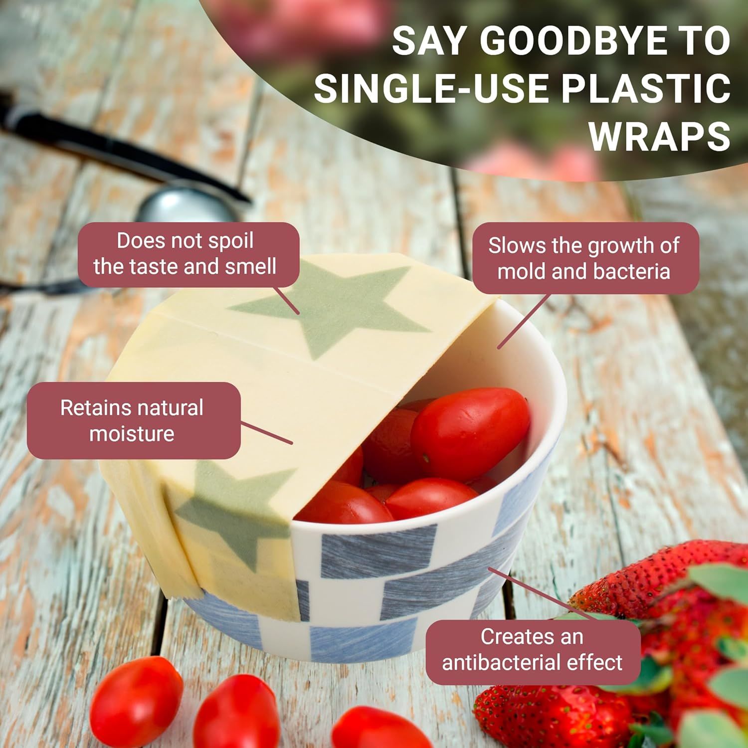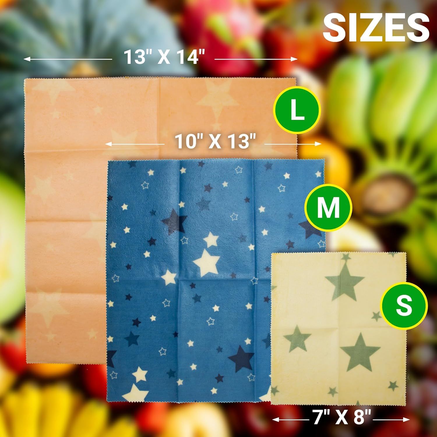 Beeswax Food Wraps. Pack of 3 Assorted Organic Bee Wax Wrapping Papers with Flowers. Reusable Set of Small; Medium; Big Natural Cloth Wrappers
