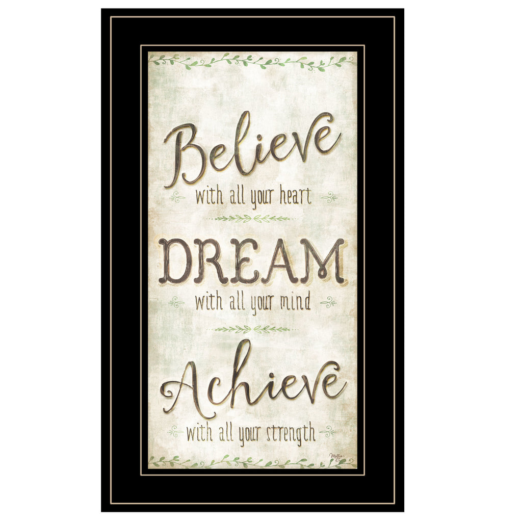 MOL1151-704G Believe, by artisan Mollie B. This decorative black framed 12x21 print speaks of Believe, Dream, and Achieve. Framed prints arrive ready to hang. •TEXTURED ARTWORK with a 'rolled on' acid-free acrylic coating to create a canvas painting effect.•UV PROTECTANT COATING protects artwork from fading. No glass is necessary.• MOULDING adds natural beauty to the framed art. Frame is keyholed for the easy hanging.•THIS FINE HOME DECOR piece made in the USA by Woman Owned Business (WBE) is a perfect gift for a friend or relative.