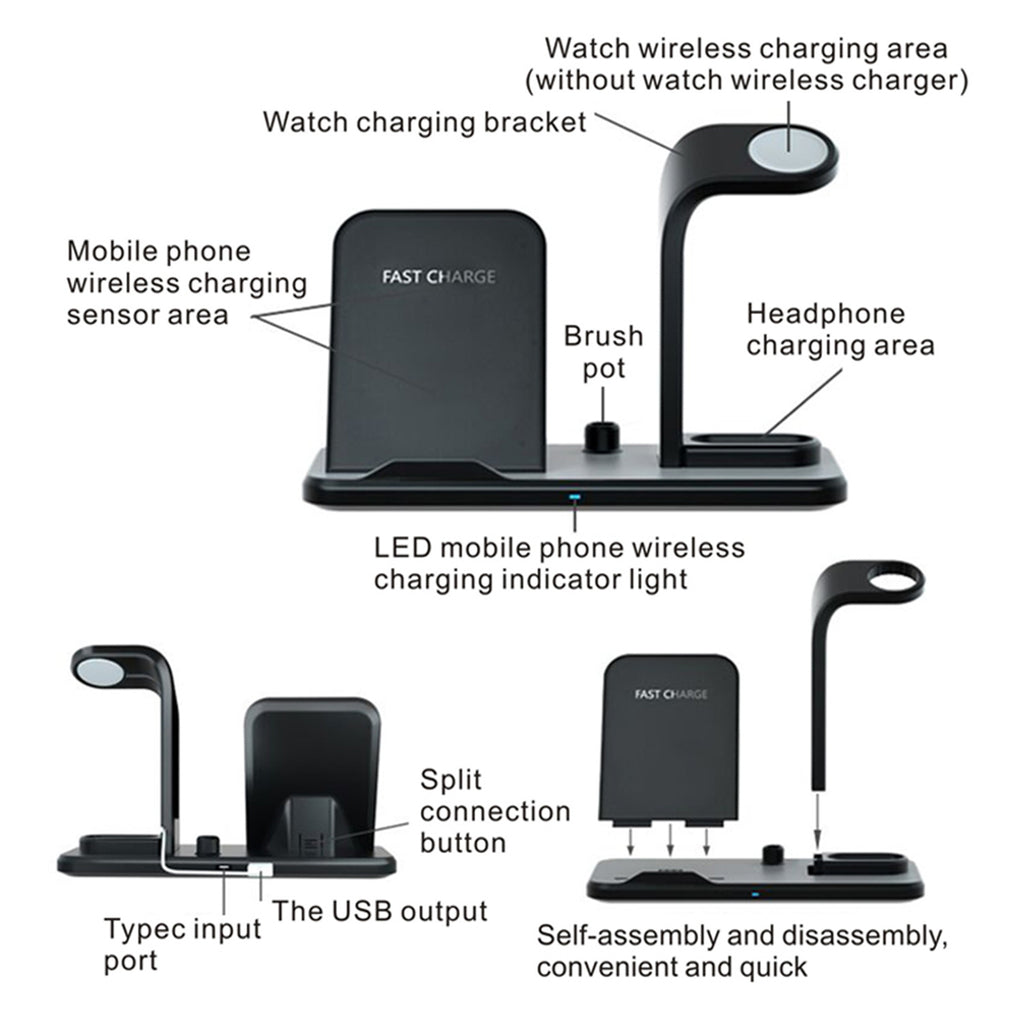 4 in 1 design, it can hold and charge your smart watch, mobile phone, stylus and headset at the same time.