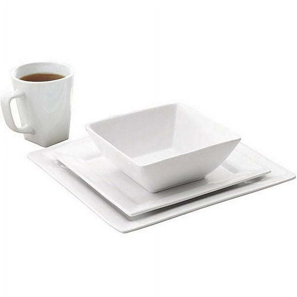 Upgrade your dining collection with the Better Homes & Gardens 16 Piece Square Porcelain Dinnerware Set. This set includes four dinner plates, four salad plates, four bowls, and four mugs. The pieces are also dishwasher safe for easy and quick cleanup. The stylish square design gives a unique look that goes with almost any table setup, perfect for entertaining friends or a quiet casual dinner at home. This set also features a stackable design that allows for efficient, space-saving storage in cabinets and a simple, clean, fresh look that pairs well other porcelain Better Homes and Gardens dinnerware pieces and accessories.