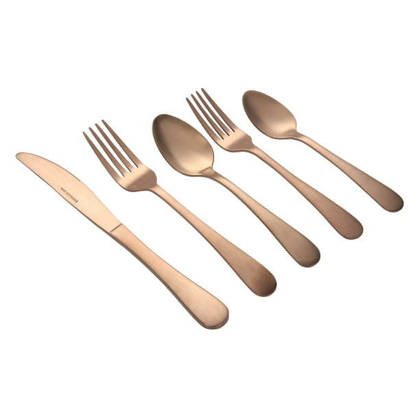 Add a subtle touch of modern elegance to your table with the Better Homes & Gardens 20-piece Arlo rose gold flatware set. Featuring a slim, rounded handle design plated in a warm metallic rose gold finish, this contemporary flatware service for 4 brings an eye-catching hint of glamour to everyday dining. The set includes 4 salad forks, 4 dinner forks, 4 dinner knives, 4 teaspoons, and 4 dinner spoons made from durable 18/0 stainless steel that retains its rich rose gold color while staying dishwasher safe for no-fuss cleaning. With its delicate pink-hued gold detailing and slim, graceful handles, this versatile flatware set transitions seamlessly from upscale dinner parties to casual weekday meals. Affordably priced and modern yet understated, the Arlo 20-piece flatware set from Better Homes & Gardens is an easy way to elevate your tablescape with a subtle touch of striking rose gold style perfect for enhancing both special occasions and everyday dining.
