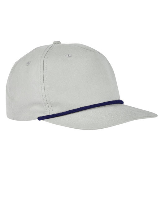 70% cotton, 30% nylon; 5-panel; Front panel lined; Half-moon mesh front panel insert; Semi-curved bill with contrasting rope; Contrasting snapback closure;