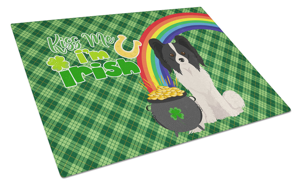 Glass Cutting Board featuring breed specific Papillon artwork. Celebrate St Patrick's Day with this St Patrick's Day Cutting Board. This Glass Cutting Board is from Caroline's Treasures collection Kiss me I'm Irish. Introduce your kitchen to the vibrant, large Decorative Glass Cutting Board from Caroline's Treasures. Crafted from resilient tempered glass, this board is not only a utilitarian necessity but also a colorful art piece. With its generous dimensions of 15 inches in height and 12 inches in length, it offers ample space for all your cutting needs. Every piece showcases captivating artwork from distinguished artists, bringing an aesthetic edge to your kitchen. Beyond its attractive design, this cutting board ensures your countertop stays pristine and unscathed, owing to its heat-resistant properties. Engineered with user convenience in mind, it features non-skid feet for stability, and rounded corners for additional safety. Its robust construction renders it virtually unbreakable, guaranteeing longevity. The board comes with protective feet bumpers, maintaining its position during use. This product is recommended to be hand washed only. Proudly printed and assembled in the United States, this cutting board exemplifies superior craftsmanship. With Caroline's Treasures' Decorative Glass Cutting Board, you're investing in a blend of functionality and artistic flair.