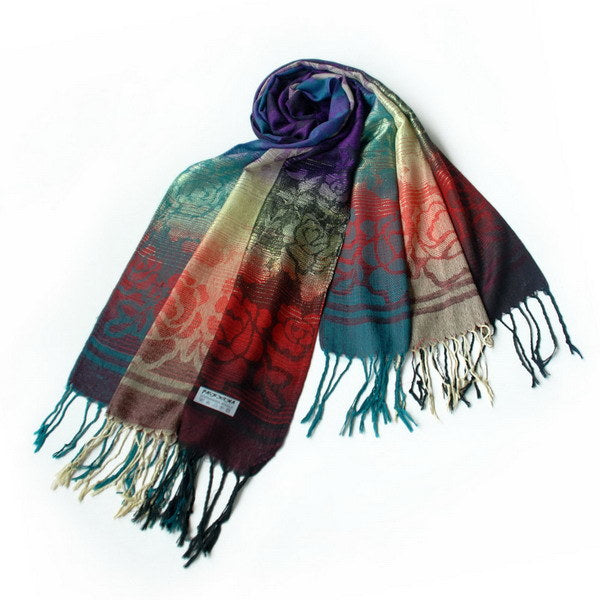 Rose patterns Pashmina measures 68 by 27 inches with 5 inches tassel. It is light, exquisitely soft?modern elegant with many roses patterns on it. The three contrast colors in the pashmina fully reflect the trends of fashion and show personality of modern young people. Three strips give pashmina a sense of make a sense of elegance yet chic, feminine charms yet passion. What's more, it comprises of 55% pashmina and 45% silk. The super High quality of material keeps you warm and comfortable in four seasons. It would be an ideal accessory to any outfits on any occasions. You deserve such an wonderful, elegant, and lightweight shawl. Lightweight, luxurious silky soft, and comfortable.Chic & distinctive pattern, a sense of fashion and elegant, fringed at both ends of the pashmina.Like an aesthetic art,it is a perfect and suitable accessory with any outfit.High-quality material, it is a best gift for women.Pashmina measures 68 by 27 inches with 5 inches tassel, contains 55% pashmina and 45% silk.
