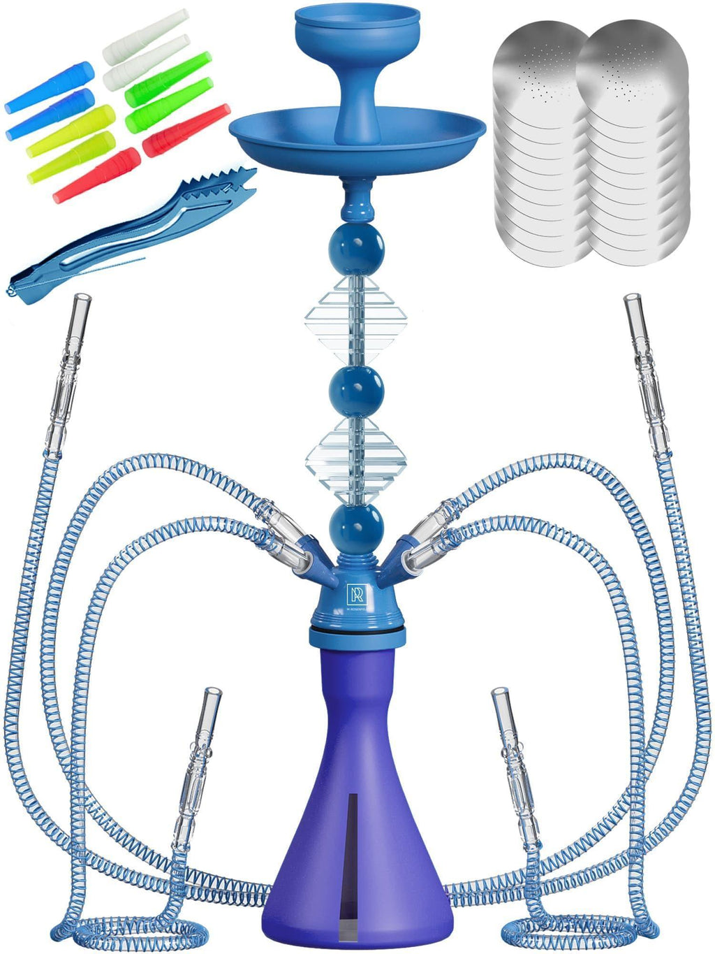 1.portable hookah set with everything 4 hose - experience the ultimate convenience with our portable aluminum black hookah with 4 hoses. this set includes everything you need: a big silicone bowl hookah, four hookah hose blue, 50 prepunched foil sheets for hookah, 10 disposable hookah tips, and complimentary hookah tongs truly portable 4 way hookah - this complete hookah kit is ready to use right out of the box, making it perfect for travel, camping adventures, or casual gatherings with