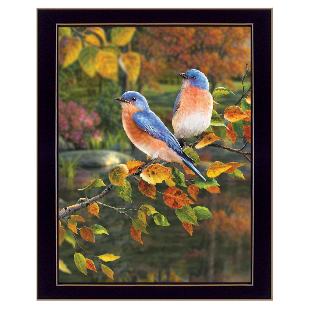 NFA171-712 - Bluebirds, a black framed print (14x18) by Kim Norlien. A pair of bluebirds perched in a tree showing fall colors. The surface of the print is textured with a fade resistant coating so no glass is necessary. Arrives ready to hang. Made in the USA by skilled American workers. •TEXTURED ARTWORK with a 'rolled on' acid-free acrylic coating to create a canvas painting effect.•UV PROTECTANT COATING protects artwork from fading. No glass is necessary.• MOULDING adds natural beauty to the framed art. Frame is keyholed for the easy hanging.•THIS FINE HOME DECOR piece made in the USA by Woman Owned Business (WBE) is a perfect gift for a friend or relative.