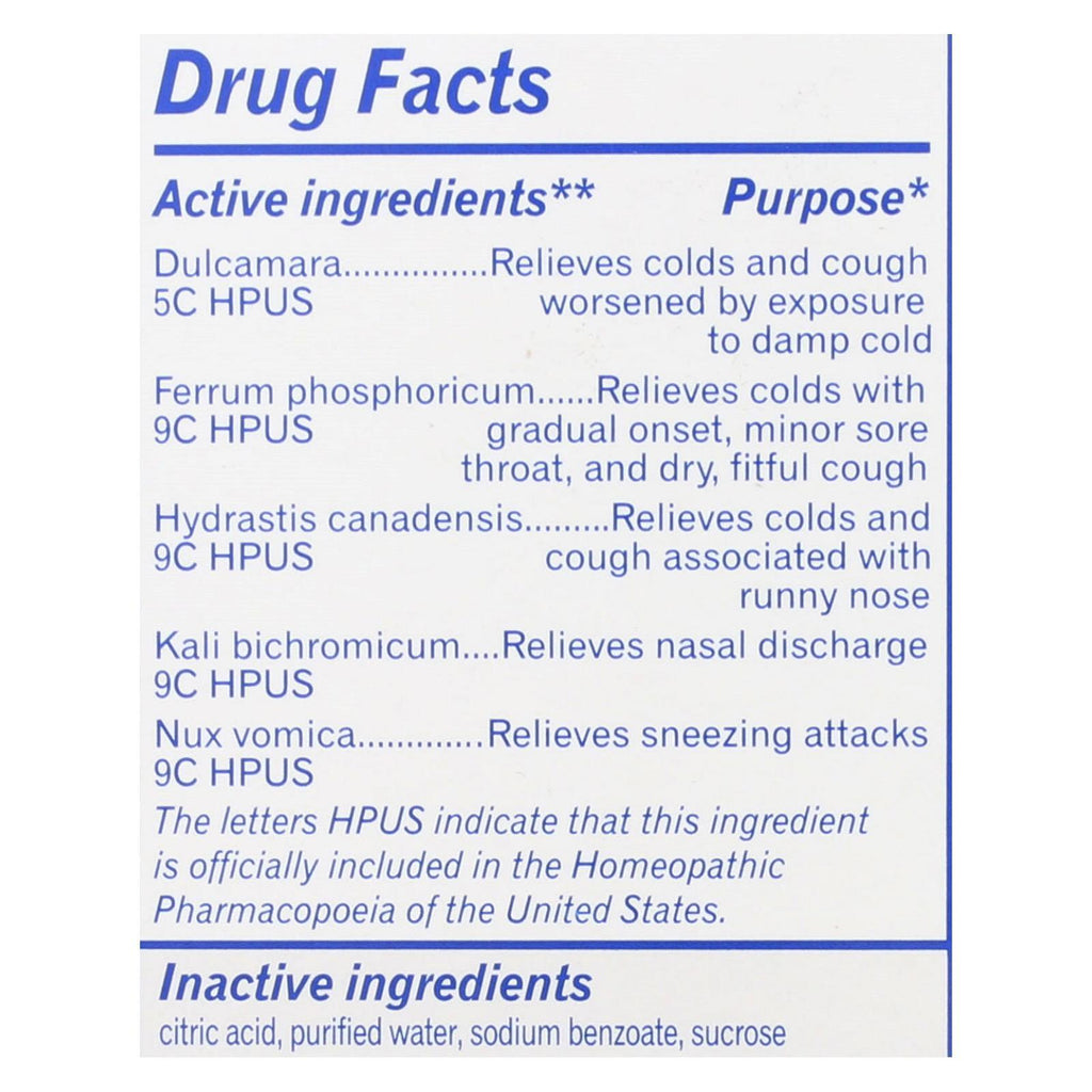 ingredients : active ** dulcamara 5c hpus purpose* relieves colds and cough worsened by exposure to damp cold ferrum phosphoricum 9c hpus purpose* relieves colds with gradual onset;minor sore throat;and dry;fitful cough hydrastis canadensis 9c hpus purpose* relieves colds and cough associated with runny nose kali bichromicum 9c hpus purpose* relieves nasal discharge nux vomica 9c hpus purpose* relieves sneezing attacks inactive citric acid;purified water;sodium benzoate;sucrose